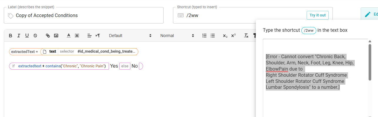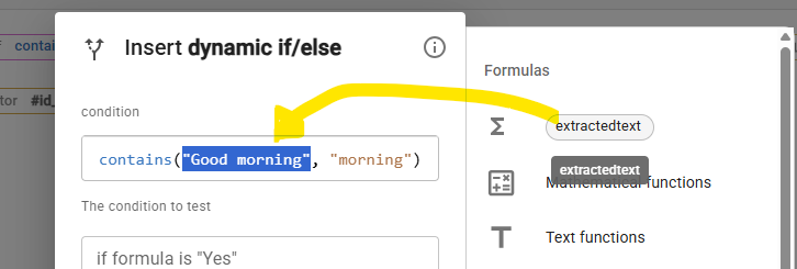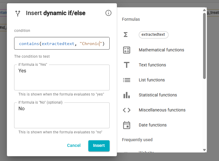 I have then added an IF/Else function and what it to look at the text from the "extractedText" and see if contains any of the word "Chronic" or "Chronic Pain"