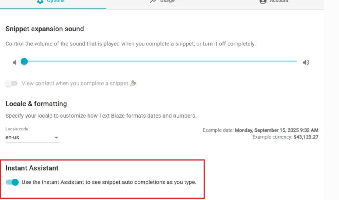 Or, using our assistant feature that lets you easily pull up a list of all your snippets. The default keyboard shortcut for it is Command-Shift-Space, but you can change this to whatever you want in the Chrome extension settings.